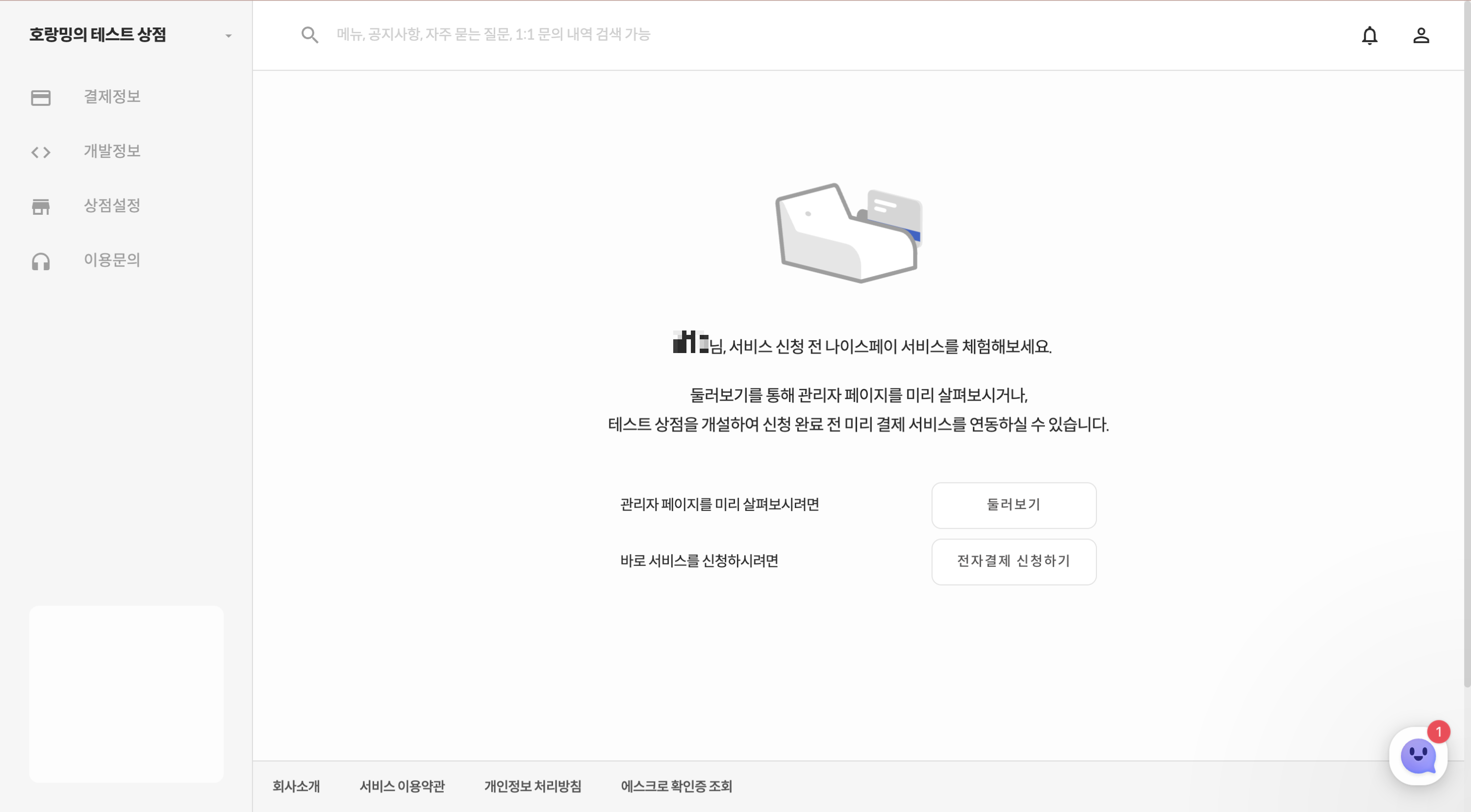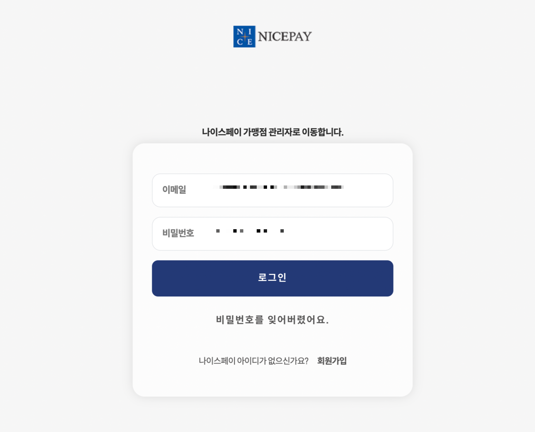먼저 나이스 페이먼츠 결제연동 사이트로 가 회원가입 후 로그인을 한다.