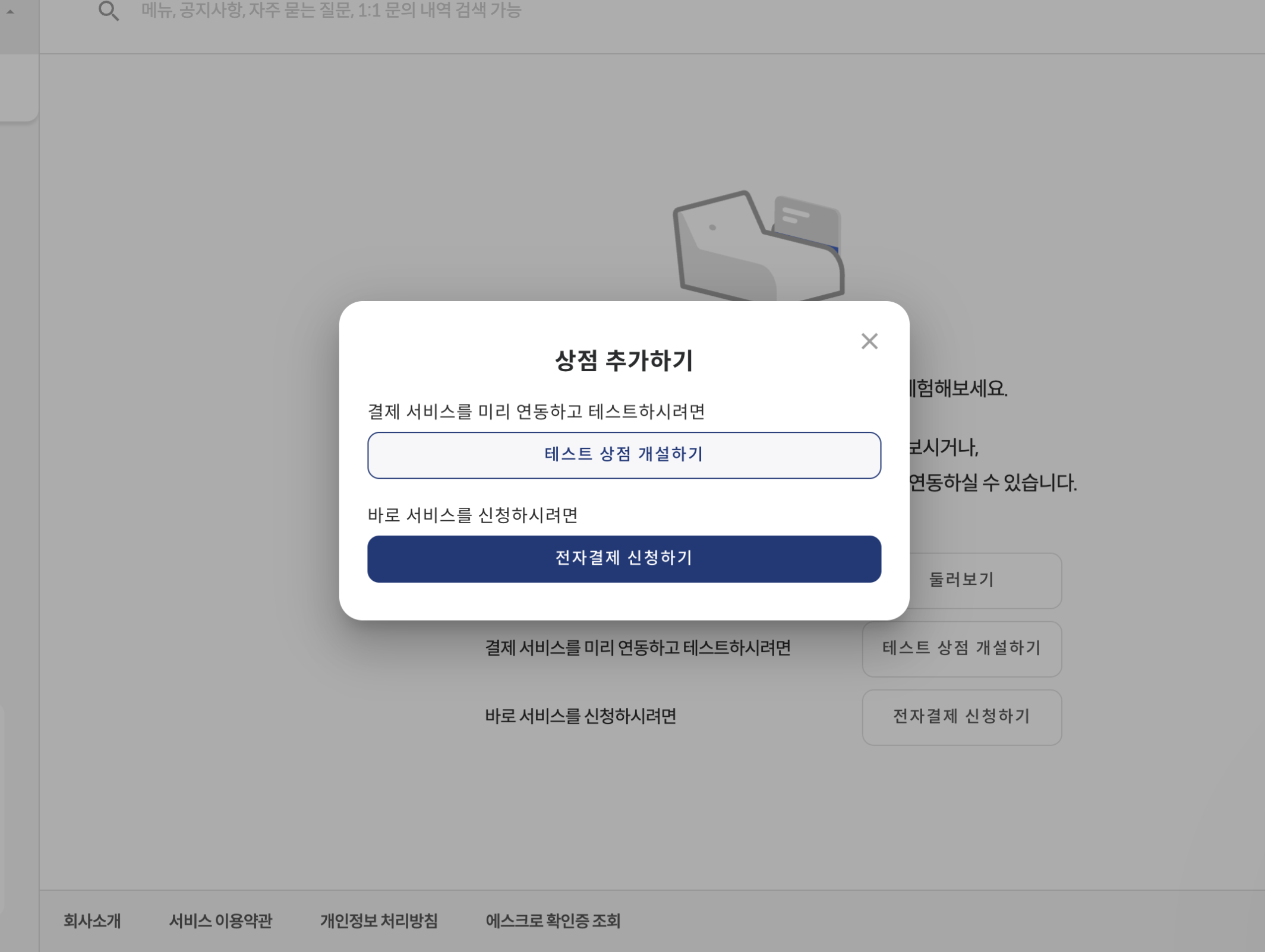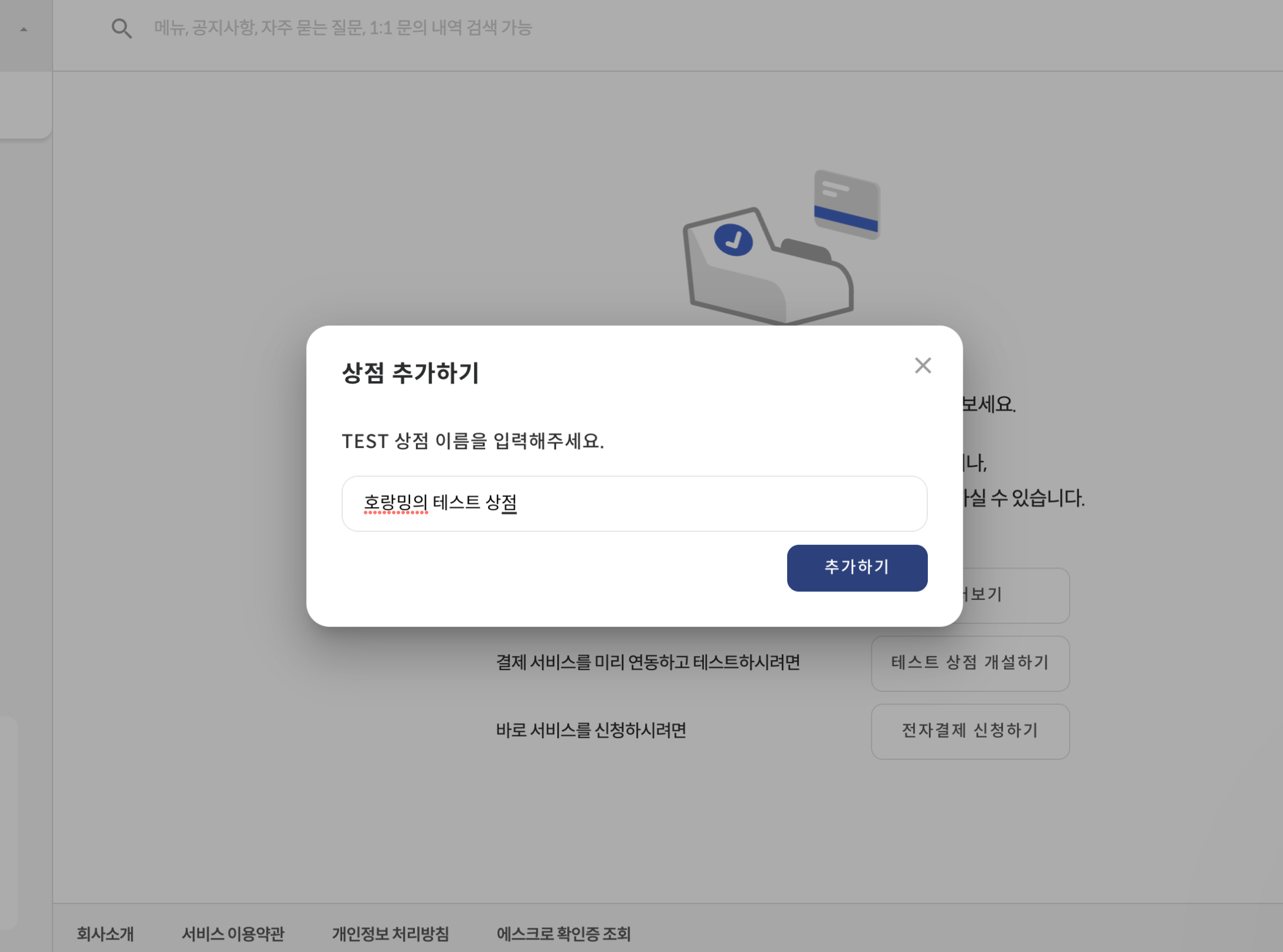 상점 추가하기에서 테스트 상점 개설하기 클릭 후 상점 이름을 설정한 다음 추가하기를 클릭한다.