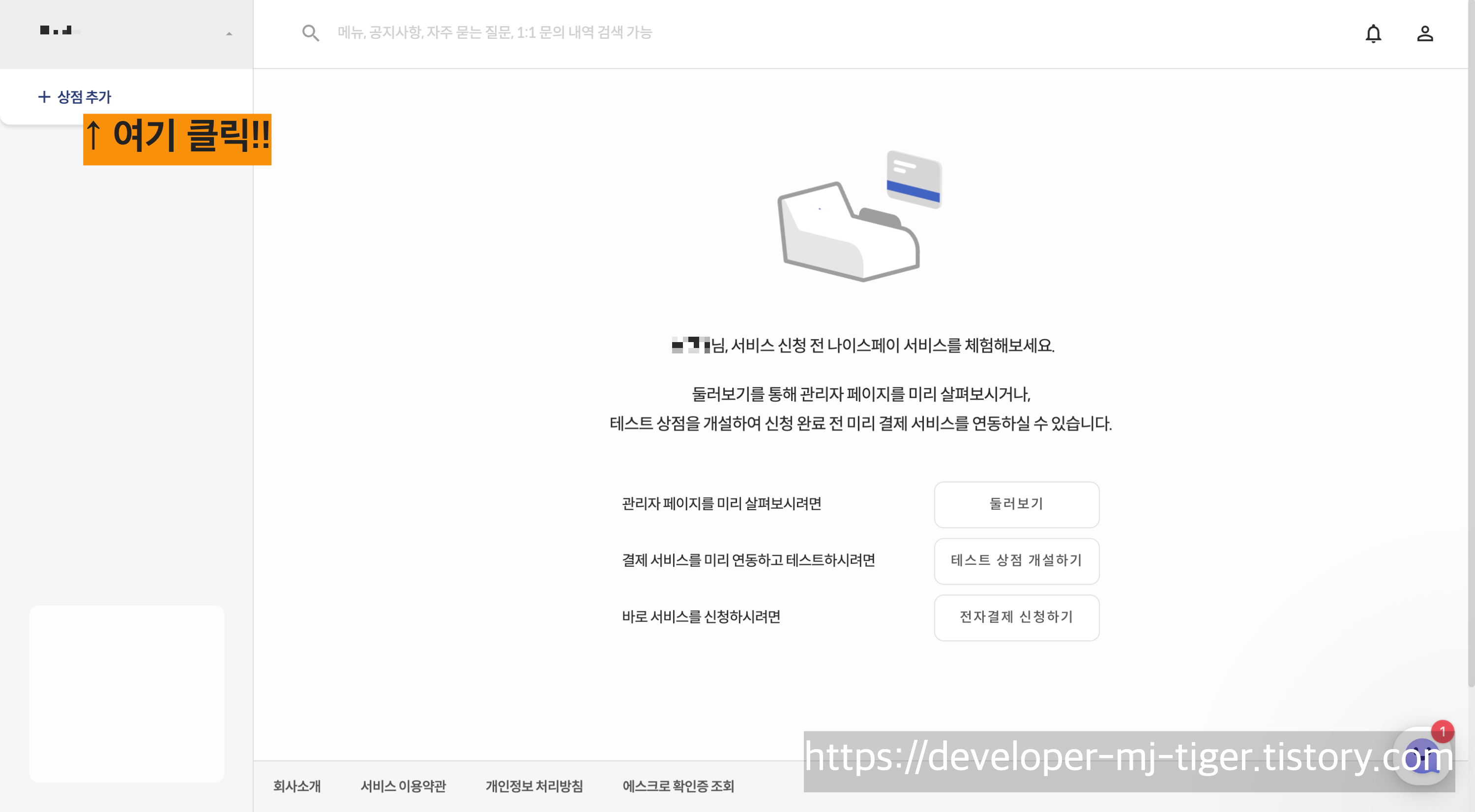 로그인을 하면 아래 사진의 화면이 나타난다. 왼쪽 상점 추가를 누르면 테스트용 상점을 추가할 수 있다.